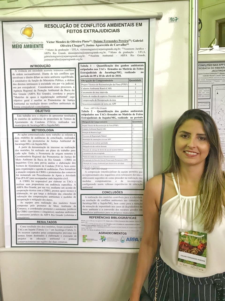 O trabalho intitulado “Resolução de Conflitos Ambientais em feitos extrajudiciais” apresentou os resultados referentes ao projeto coordenado pela ARPA denominado “Mutirões de apoio à regularização ambiental”, realizado nos municípios mineiros de Itajubá e Jacutinga, cujo objetivo geral é auxiliar as Promotorias de Justiça de defesa do Meio Ambiente na resolução de conflitos dessa natureza, na forma extrajudicial e conciliatória por meio da elaboração e propositura de Termos de Ajustamento de Conduta – TACs.