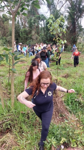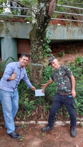 Na segunda ação, foi dada continuidade no projeto de identificação de flora na trilha arbórea dentro da fazenda do Instituto Federal, para o qual foram confeccionadas dezenas de placas com identificação das espécies encontradas na trilha. Nas placas constam nome das respectivas árvores, um Qr Code, que por meio de tecnologia presente em smartfones direciona os visitantes da trilha a um documento mais elaborado, no qual constam várias informações sobre as espécies constantes no acervo florestal da mata dentro do Campus. Essa ação também foi realizada com participação direta dos alunos do IFSULDEMINAS, sob a orientação técnica do Professor aposentado Laércio Loures e ocorreu por volta das 10 horas.