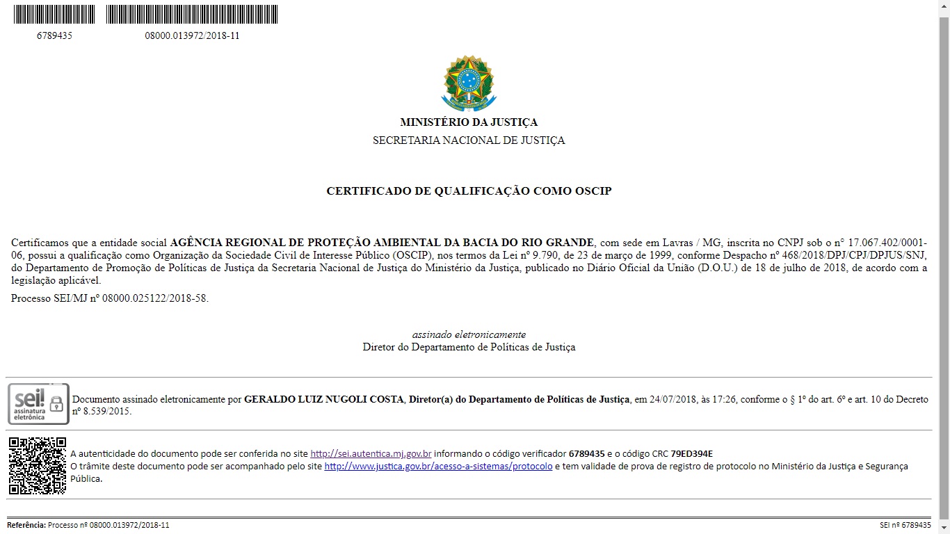 No dia 18 de julho de 2018 foi publicado no Diário Oficial da União o deferimento da qualificação como Organização da Sociedade Civil de Interesse Público (OSCIP) da Agência Regional de Proteção Ambiental da Bacia do Rio Grande – ARPA Rio Grande.