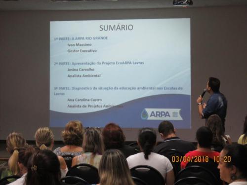 No dia 03 de abril de 2018 foi realizado o encontro de lançamento do projeto EcoARPA Lavras, coordenado pela ARPA Rio Grande. O encontro contou com a presença de 32 educadores, representando 21 instituições de ensino do município, que responderam de forma maciça ao convite. O apoio da Superintendência Regional de Ensino de Campo Belo, Secretaria Municipal de Educação e de Meio Ambiente foi essencial para o sucesso do evento.