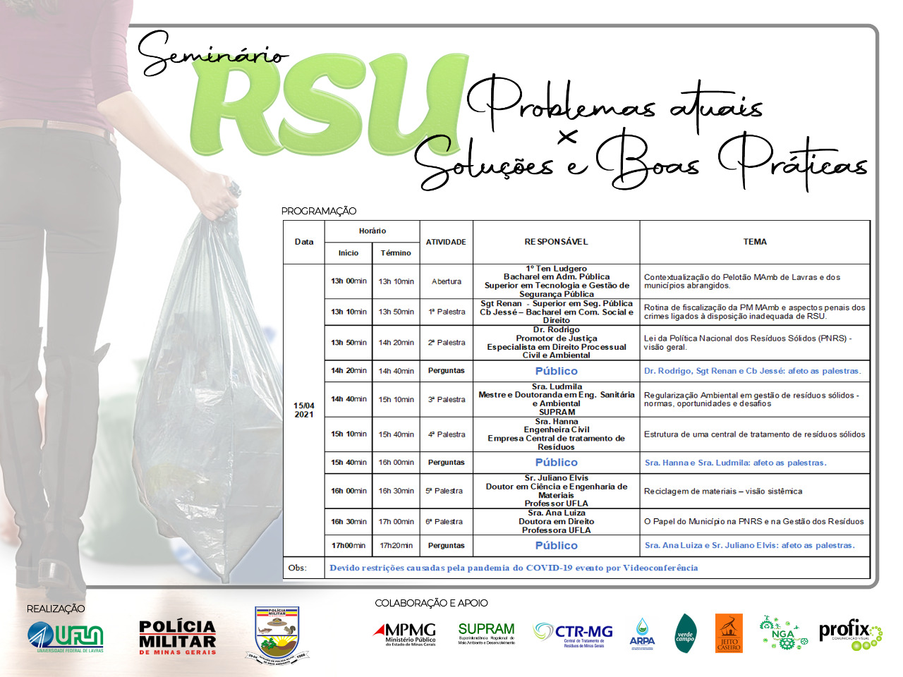 Serão apresentados assuntos que vão desde questões da Política Nacional de Resíduos Sólidos, perpassando por áreas como licenciamento, regularização, fiscalização de empreendimentos até as questões do funcionamento de uma central de tratamento de resíduos e dos procedimentos da reciclagem.